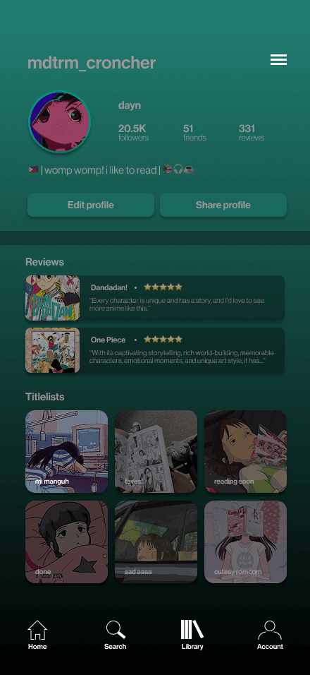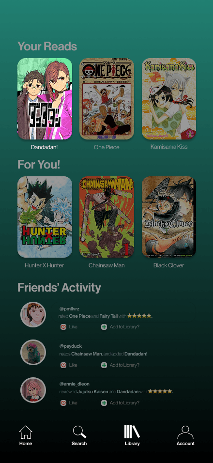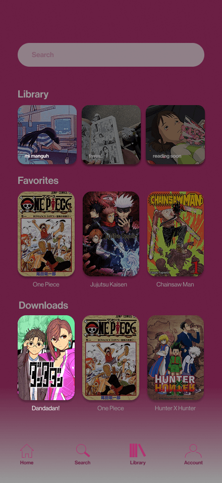 My first solo, and my second work on a UI/UX project. Designed for webtoon and manga readers. Produced with Figma. Presented with Canva. Each screens are provided with each collections' purposes. Unfortunately, I have no record of the brainstorming process of this project.