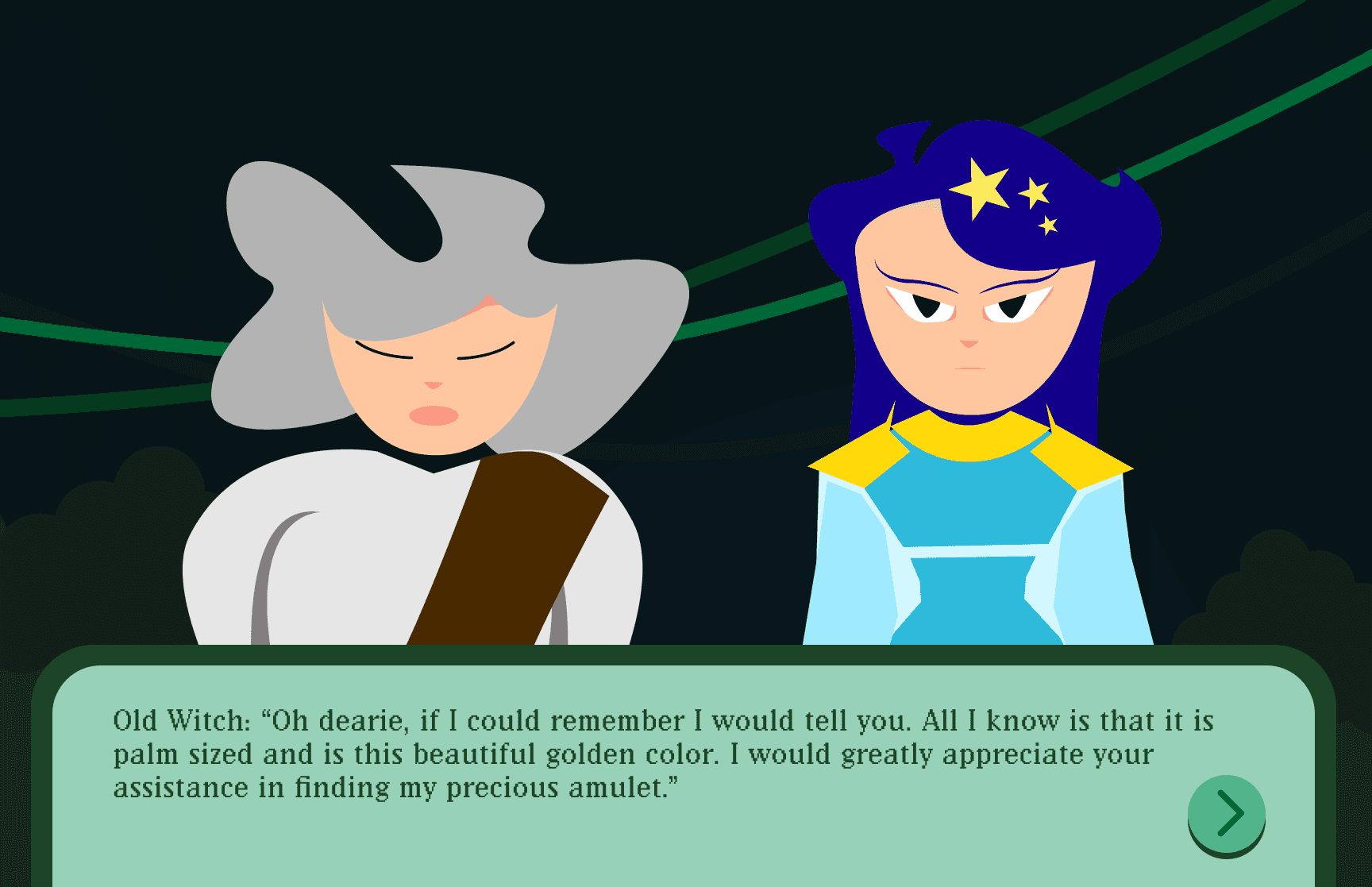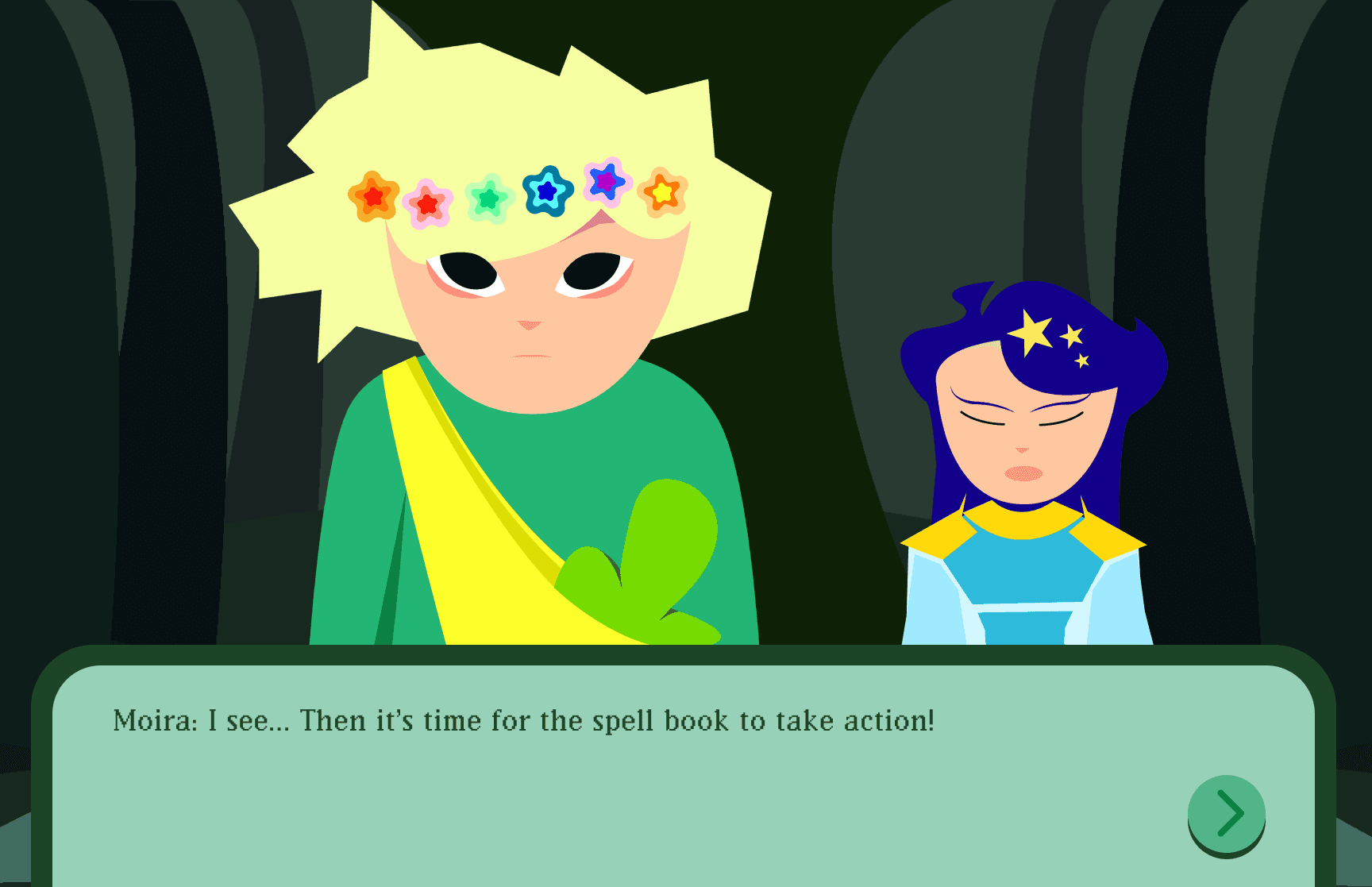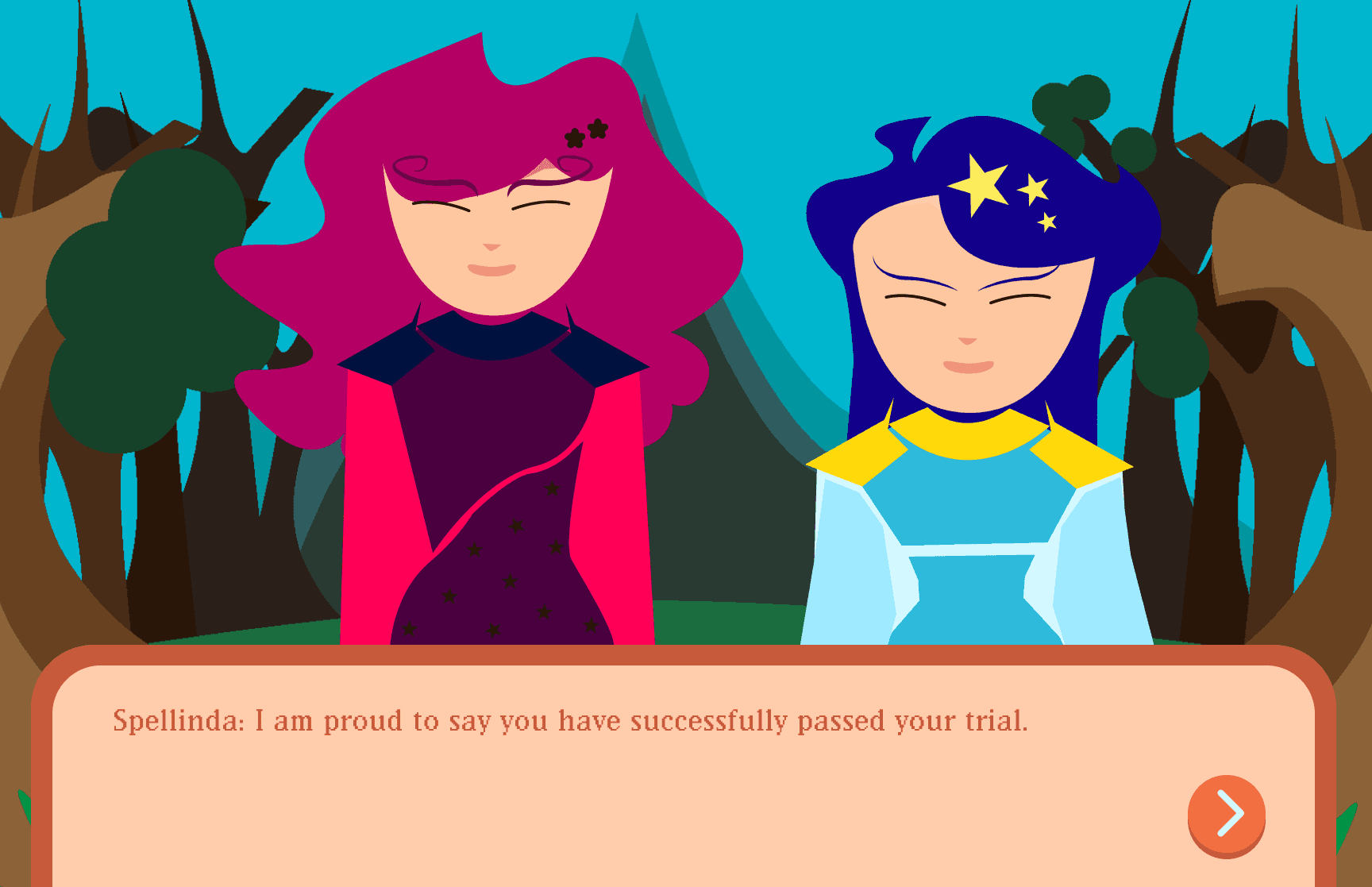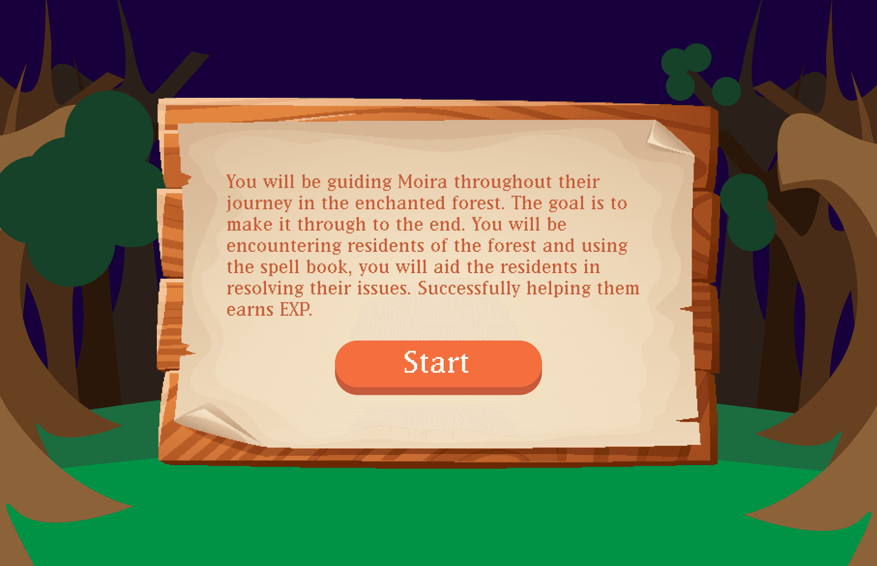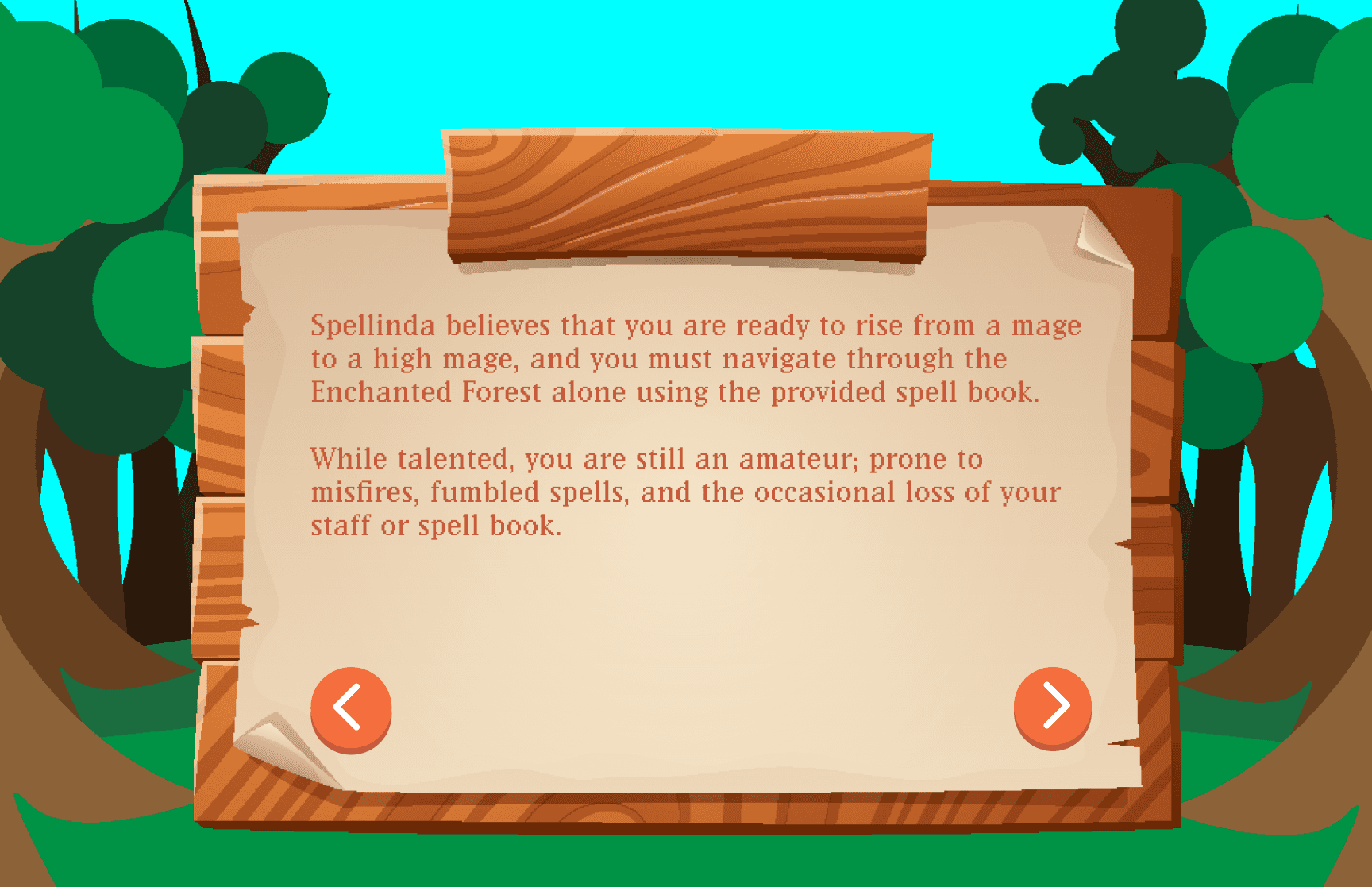 The experience combines interactive storytelling with gamified spellcasting mechanics. Users guide a young mage trainee through the Enchanted Forest, selecting spells from a limited spell book. Correct decisions earn EXP, reinforcing strategic thinking, feedback clarity, and immersive user interaction.